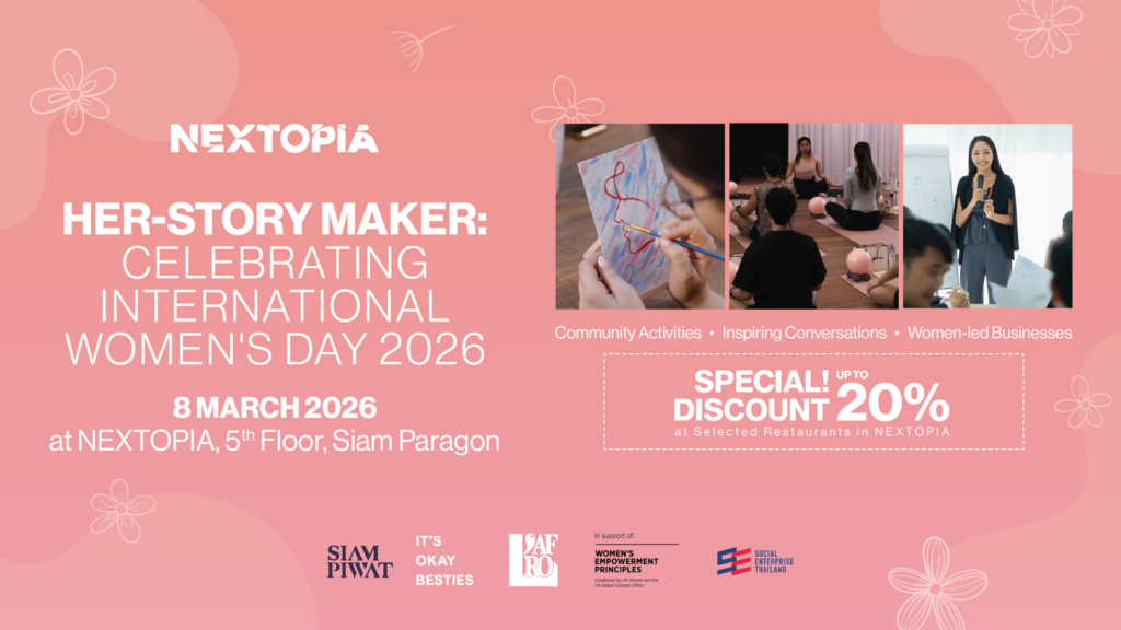 วันสตรีสากลนี้ มาร่วมเป็นส่วนหนึ่งของการสร้างปรากฏการณ์แห่งพลังหญิงใน “HER-story Maker: Celebrating International Women’s Day 2026” ที่สยามพารากอน เพื่อส่งเสียงให้โลกรู้ว่า พลังอันเข้มแข็งของผู้หญิงสามารถขับเคลื่อนเศรษฐกิจ สังคม และอนาคตที่ยั่งยืนให้เติบโตไปพร้อมกันได้อย่างแท้จริง ติดตามรายละเอียดเพิ่มเติมได้ที่ Facebook : NEXTOPIA และ Facebook : SIAMPARAGON
